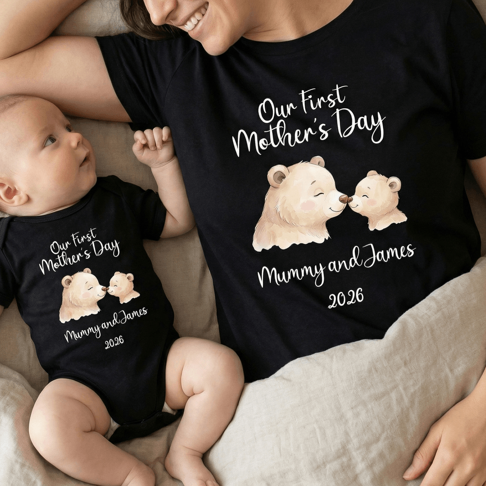 Célébrez votre lien spécial avec cet adorable set de fête des mères assorti, présentant une tendre illustration d'ours à l'aquarelle d'une mère et de son petit, accompagnée du doux message "Notre première fête des mères". Entièrement personnalisable, vous pouvez ajouter les noms de la maman et du bébé, l'année ou une phrase sincère pour créer un ensemble vraiment unique qui honore votre relation. Le motif doux et ludique est disponible en tee-shirts pour adultes et en grenouillères pour bébés, avec un style cohérent qui capture parfaitement la chaleur et l'amour de cette célébration marquante.